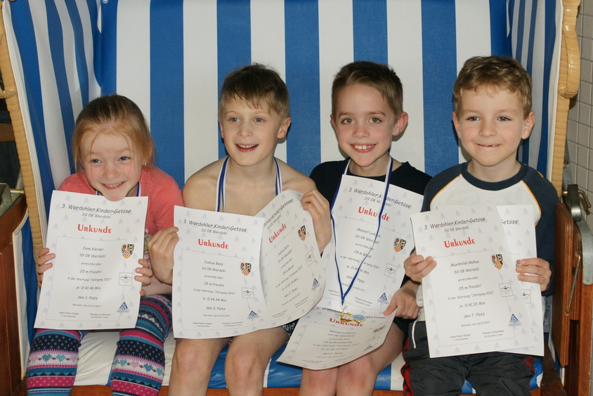 Hannah Völlmecke (Jg. 2009), Laura Meulenberg (Jg. 2008), Fabian Hofmann (Jg. 2008), Halid Irfan Kaya (Jg. 2007), Talia Dilara Ugurlu (2007) und Lena-Marie Baumann (Jg. 2004) feierten am Samstag Wettkampfpremiere. Sie gingen erstmals für den SV 08 Werdohl an den Start. Hannahs Einsatz über 25m Brust wurde gleich mit einer Silbermedaille belohnt, während Fabian zwei und Talia Dilare insgesamt drei Urkunden gewannen.
