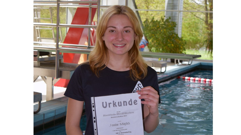 Auf der 50m-Bahn in Wuppertal absolvierte Jeanine ihre Paradestrecke nun in 1:10,48 Minuten. Sie blieb damit nicht nur deutlich unter der geforderten Normzeit, sondern belegte in ihrer Jahrgangswertung 2000 auch den 5. Platz. Bereichert um viele Eindrücke und eine Urkunde im Gepäck kehrte die 17-jährige zusammen mit ihrer Trainerin Susanne Guder nach Werdohl zurück.