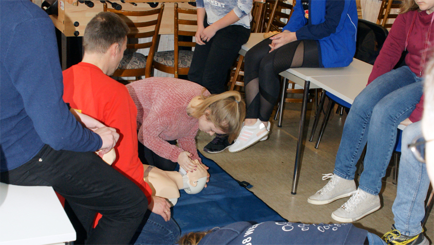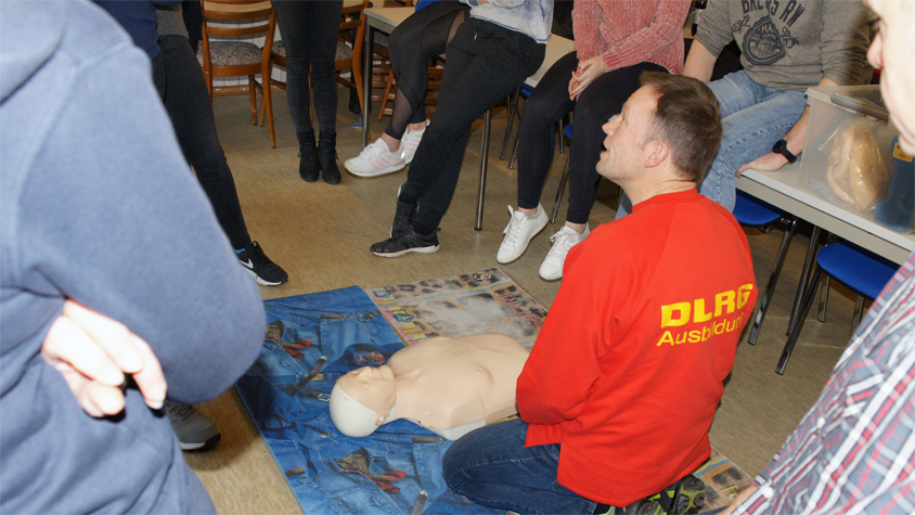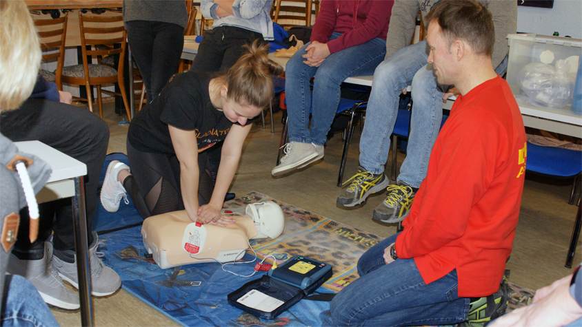 Weiterhin wurde die Herz-Lungen-Wiederbelebung (HLW), der Einsatz eines Defibrillators und die stabile Seitenlage geübt. Im Hallenbad standen dann mehrere Übungen, wie etwa das Heraufholen eines Tauchrings, das Schleppen einer Person und das an Land bringen auf dem Plan.