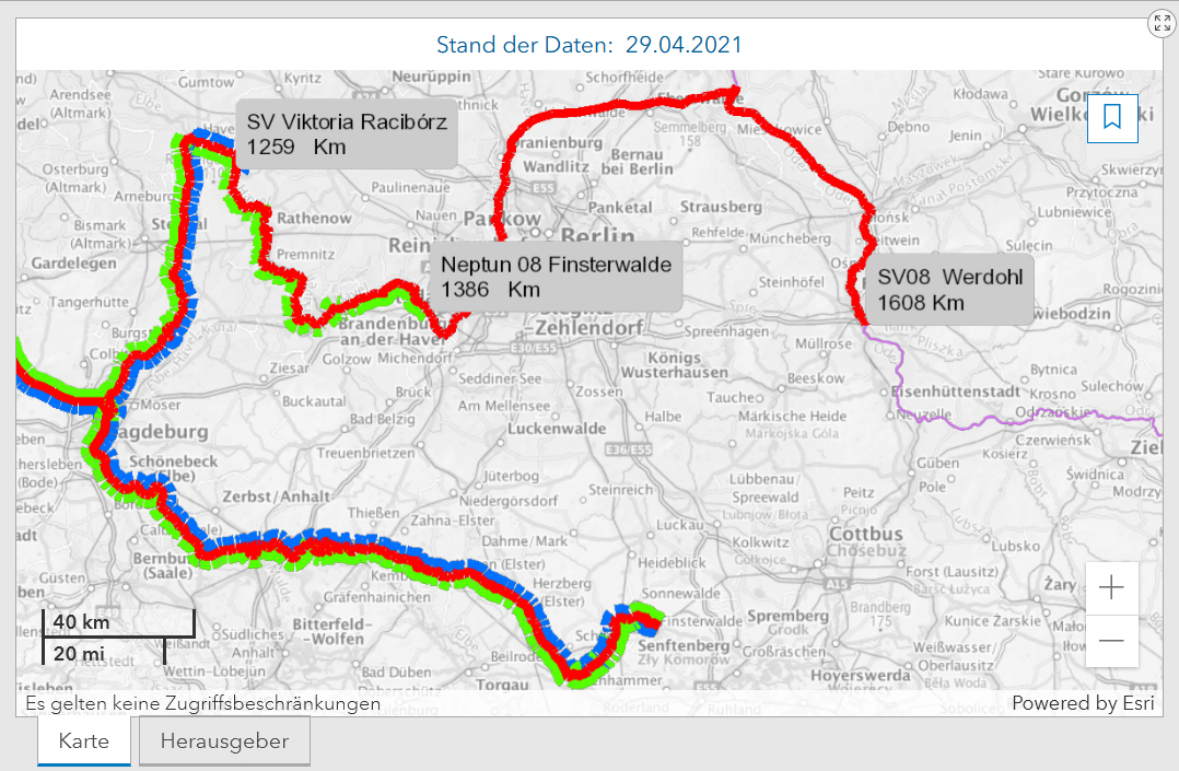 besonderes ausgedacht: Ein virtueller Schwimmwettkampf zwischen dem SV Neptun 08 Finsterwalde, dem SV Viktoria Racibórz und uns, dem SV 08 Werdohl! Aufgrund der geschlossenen Bäder natürlich nicht richtig im Wasser, sondern indem Schritte in KM umgewandelt werden. Dabei werden virtuell verschiedene Flüsse beginnend an unserem Vereinsheim nach Finsterwalde, Ratibor und wieder zurück geschwommen.